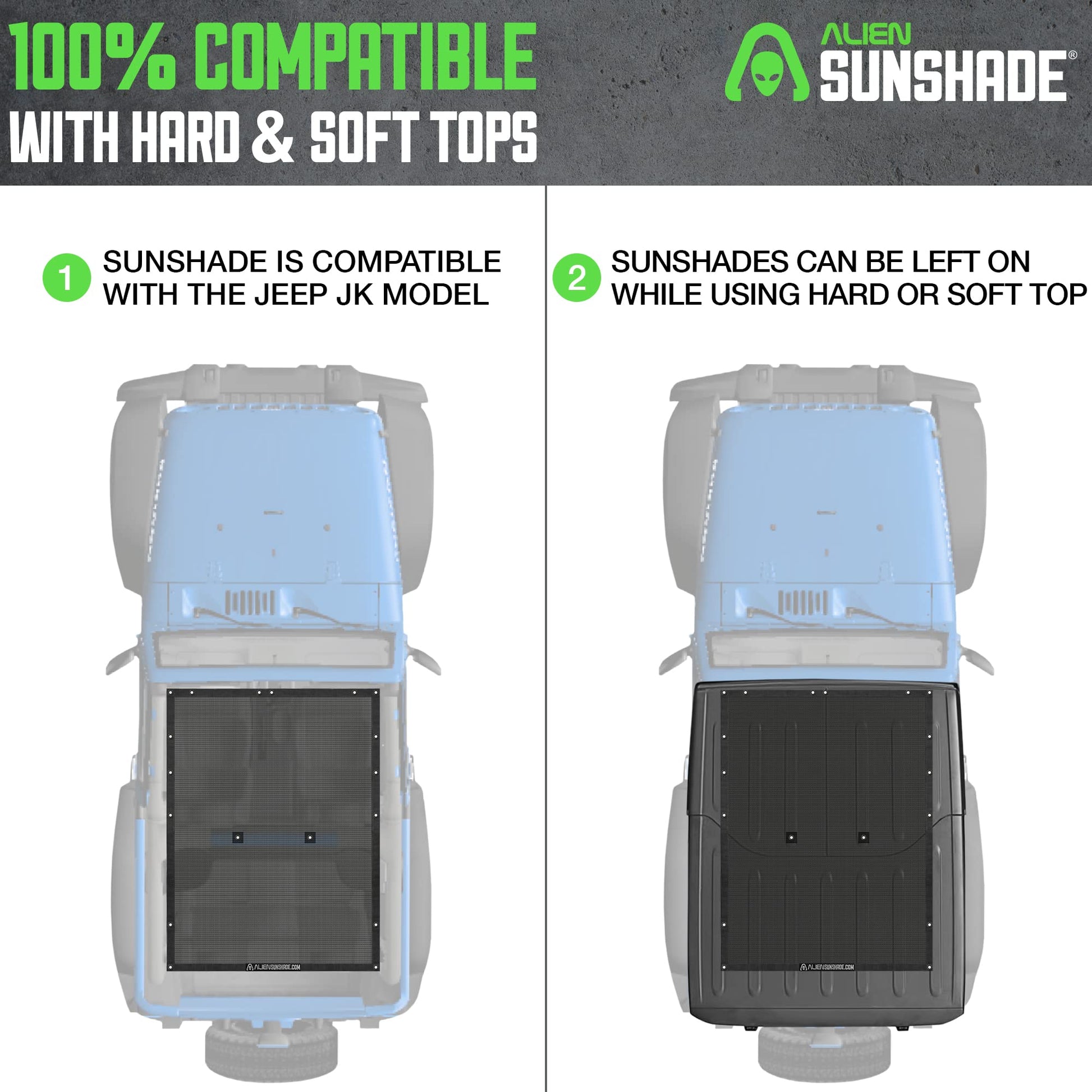- LEAVE IT ON: our Jeep Wrangler Sun Shade installs in under 30 minutes and is 100% compatible with your factory hard top, soft top and freedom panels without having to remove the Alien Shade.