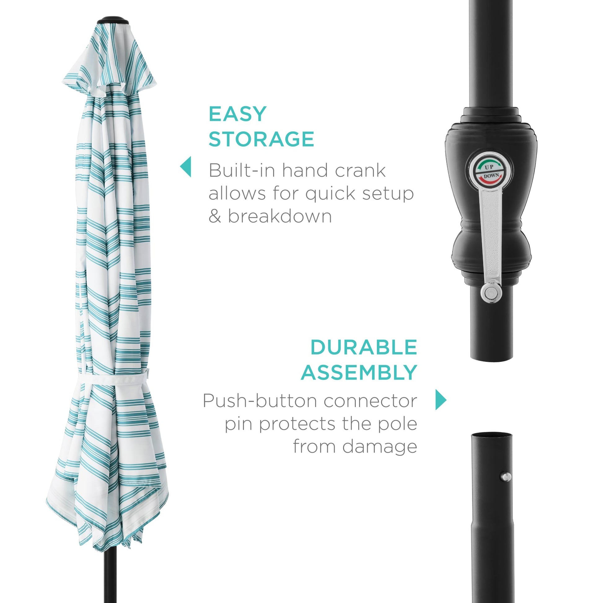 - CONVENIENT CRANK HANDLE: Features a crank handle for easy opening/closing, while its adjustable easy-tilt system allows for optimal protection from the sun