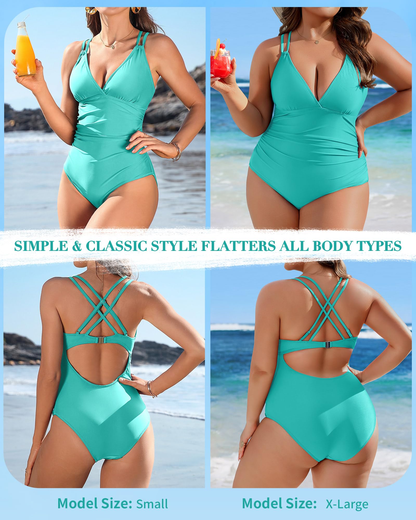 Charmo Tummy Control One Piece Bathing Suits for Women Ruched Bathing Suits Crisscross Back Swimwear L Aqua