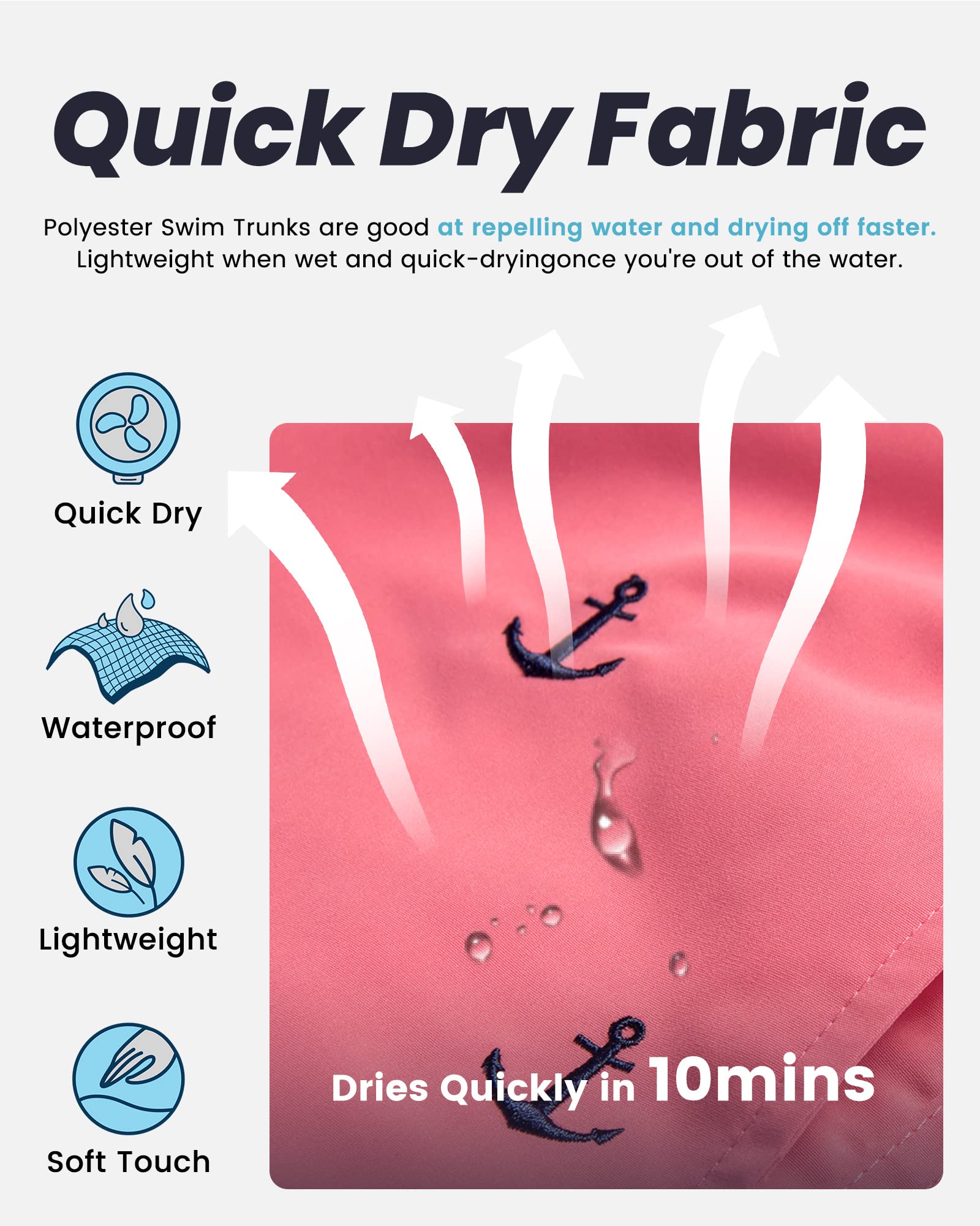 - Quick-Dry Mesh Liner: Made from lightweight polyester blend, these swim trunks dry fast, keeping you comfortable in or out of the water. An inner mesh liner provides support, prevent chafing and allows water to drain away quickly.