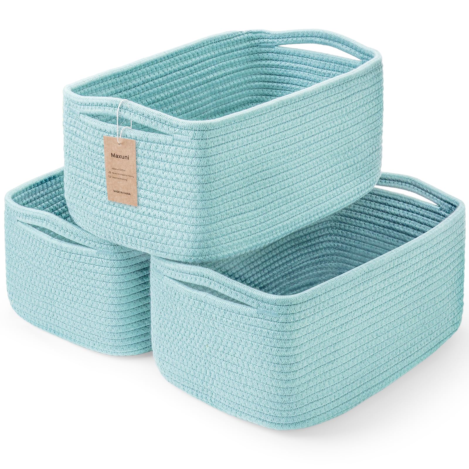 Maxuni 3-Pack Small Storage Baskets for Organizing | Woven Shelf Toy Basket | Rope Baskets for Gifts Empty | Closet Organizer Bins with Handles | Cube Decorative Box | 11.8×7.8×5.1” | Light Blue