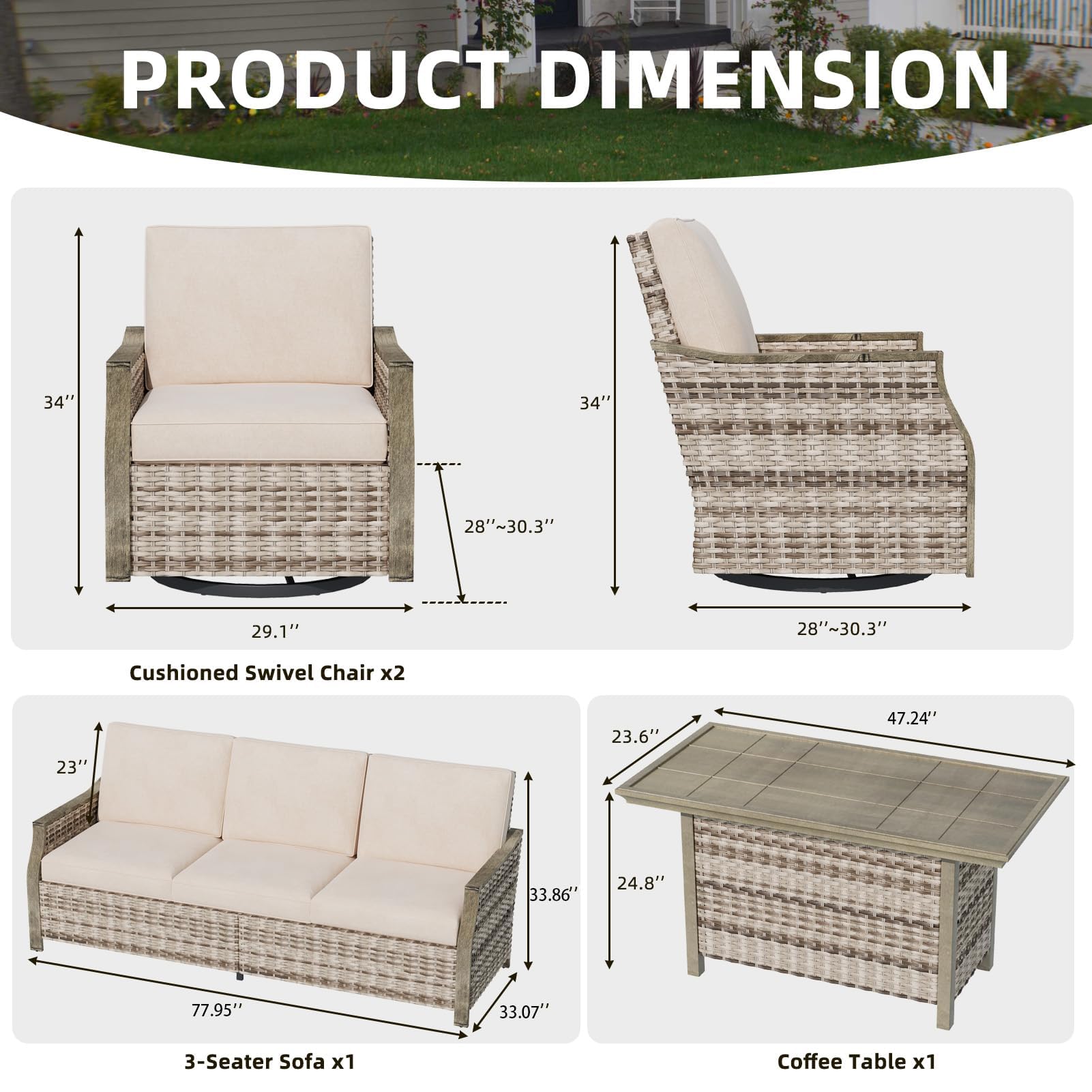 - 【4-Piece Set for Any Outdoor Space】Includes a spacious 3-seat sofa, 2 swivel chairs, and an elegant coffee table. Perfect for patios, decks, gardens, balconies, or poolside—bringing both comfort and style to your favorite outdoor areas.