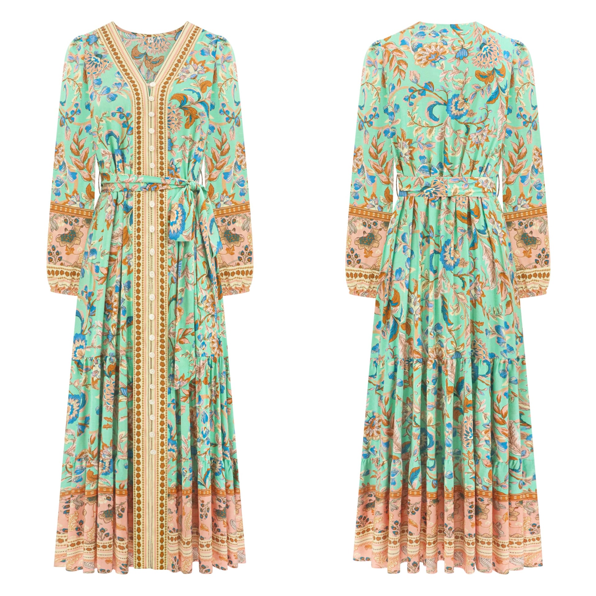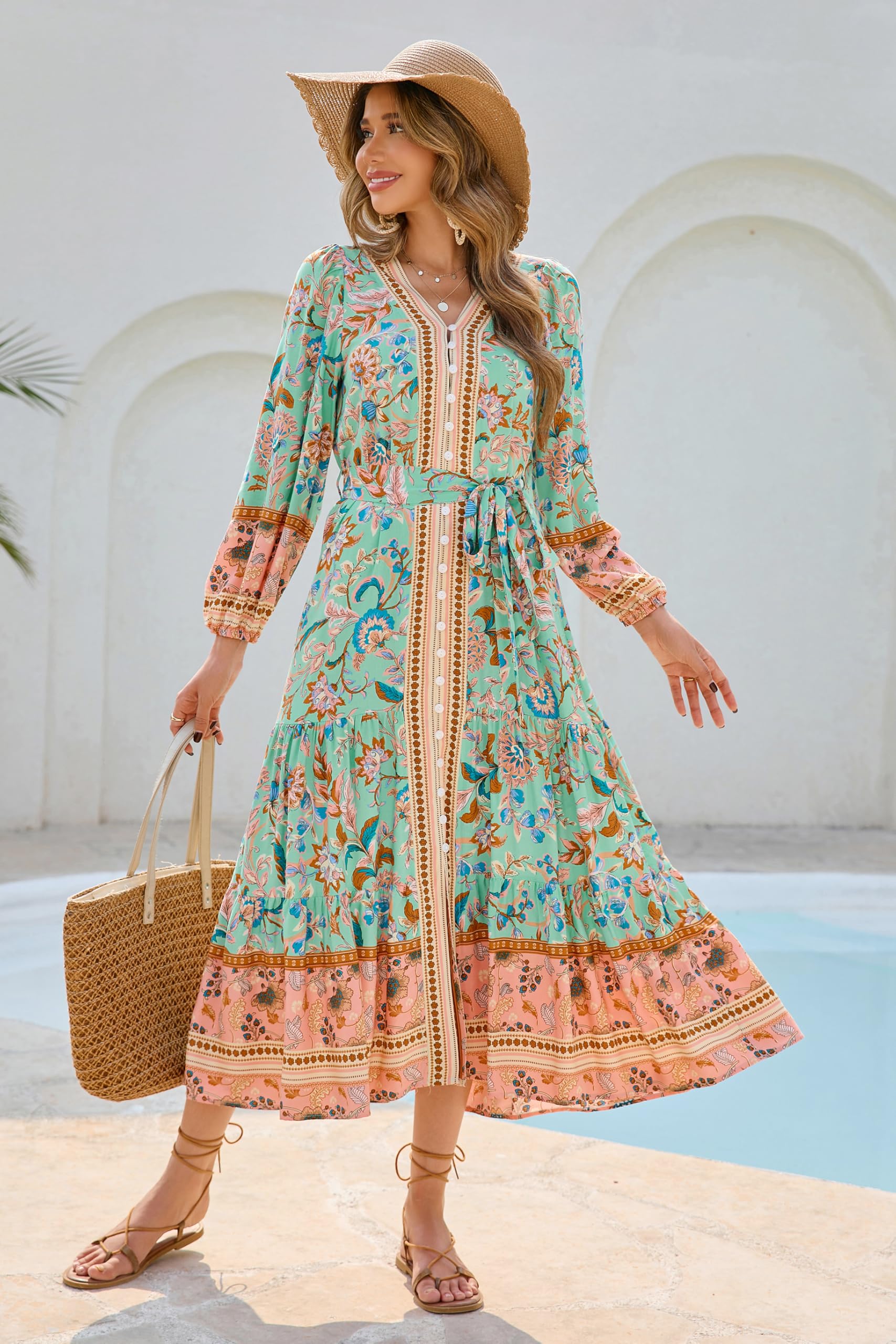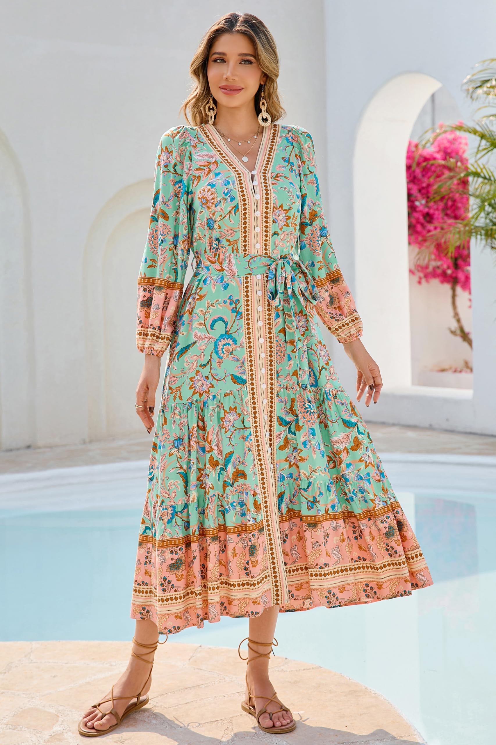 R.Vivimos Women's Long Sleeve Boho Midi Dress V Neck Floral Print Casual Button Down Loose Ruffle Beach Long Dress with Belt (X-Large, Aqua)