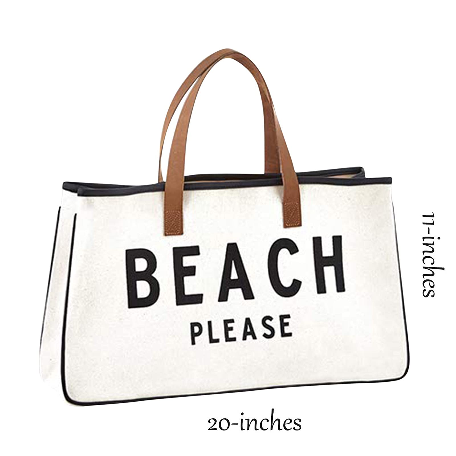 - BEACH PLEASE written in bold black lettering on white canvas; genuine leather handles and trim; timeless design complements any outfit