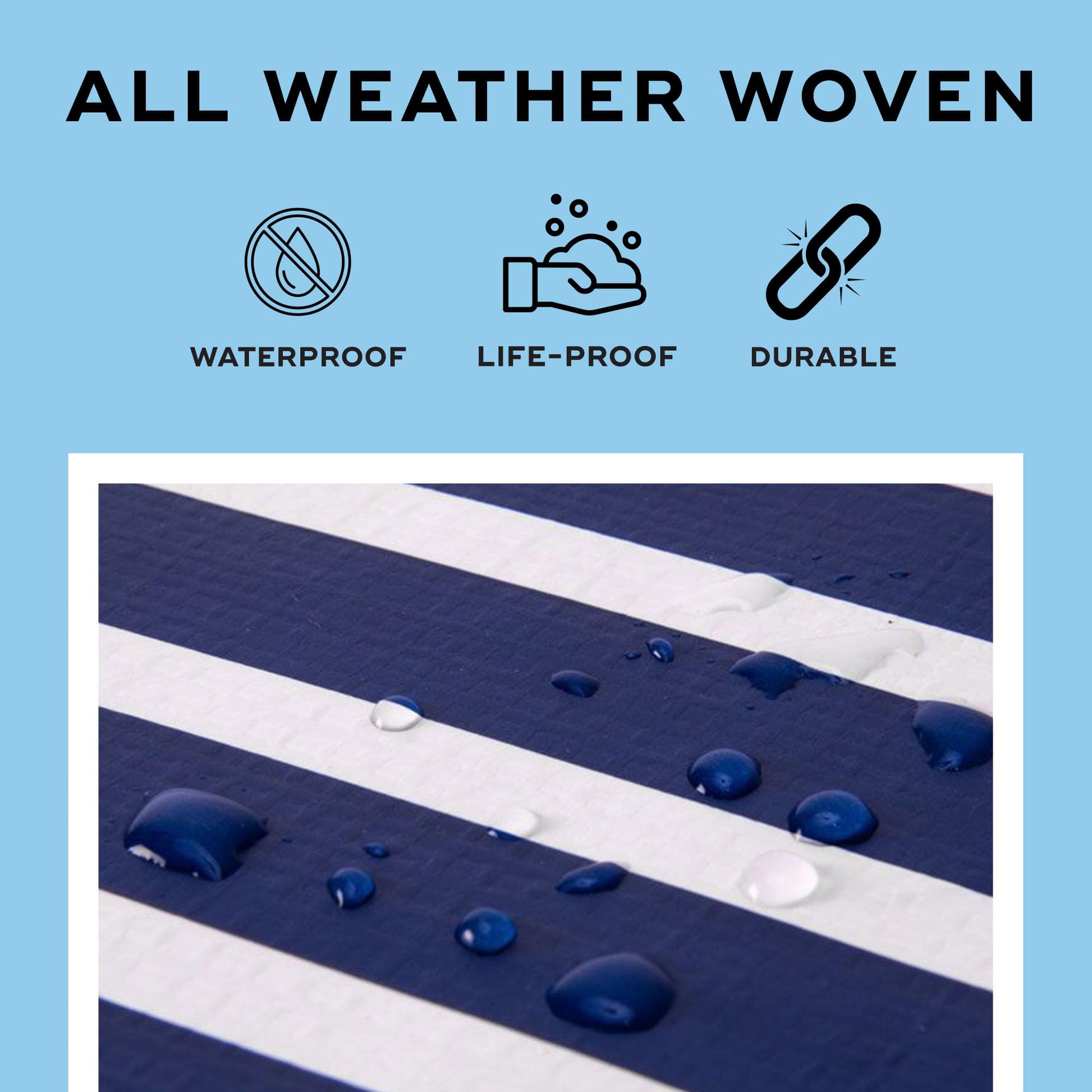 - ALL-WEATHER WOVEN fabric is made of interwoven polypropylene creating a light, but strong and water-resistant material (like a tarp). This durable, easy-clean fabric holds its shape when wet, dries fast, and softens with wear
