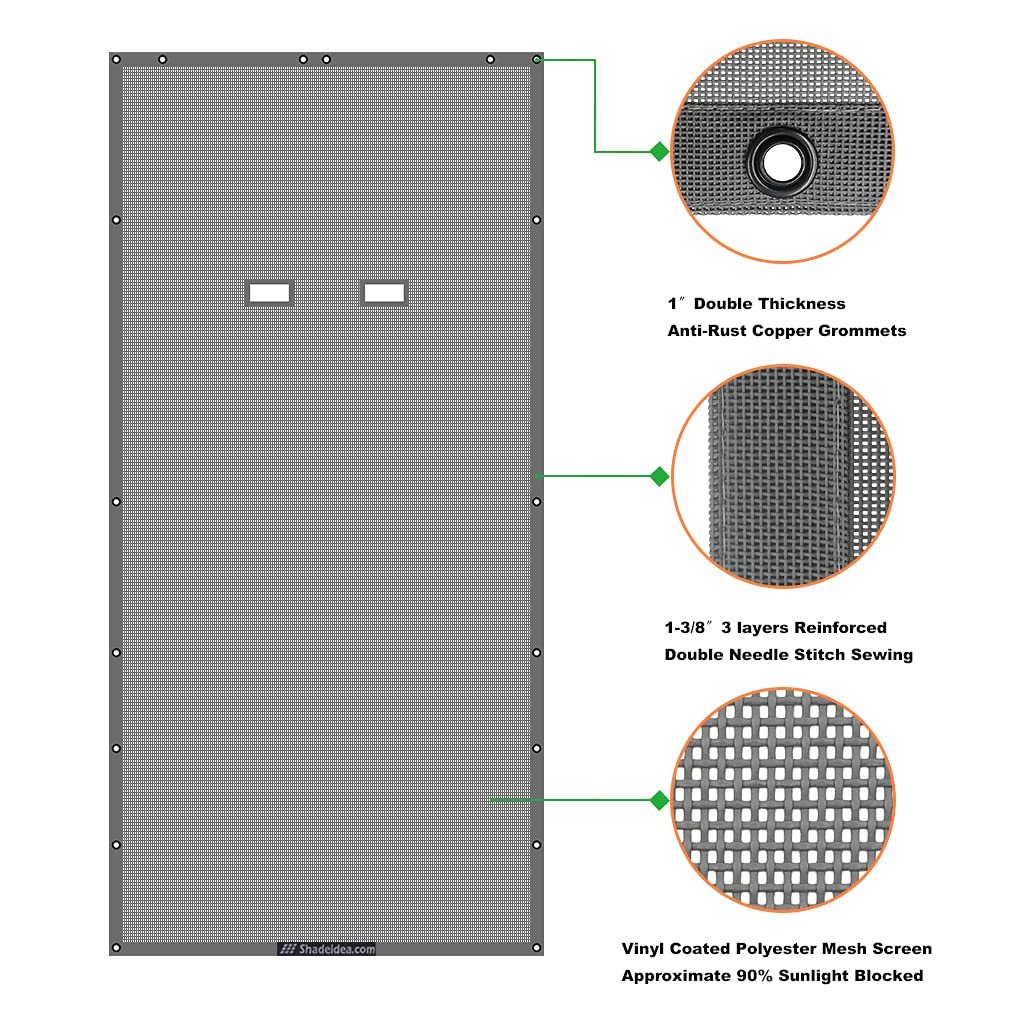 - STRONG MATERIALS: Vinyl coated super high strength polyester Mesh Screen, 3 layers folded edge with double needle stitch sewn, black finished double thicker copper grommets made.