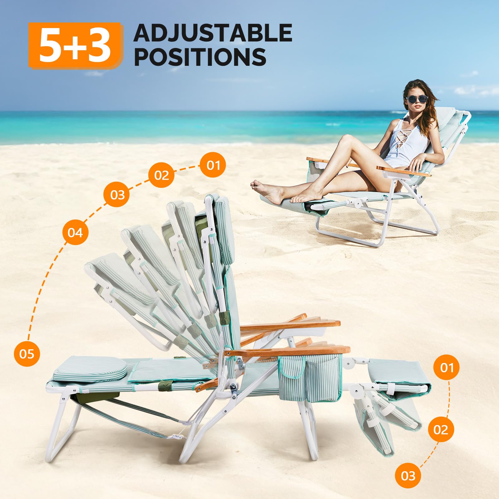 - Portability: Equipped with a shoulder strap, this beach chair with foot rest is easy to carry. The armrests also have convenient holes for easy lifting, allowing you to effortlessly move and store the beach lounge chairs for adults