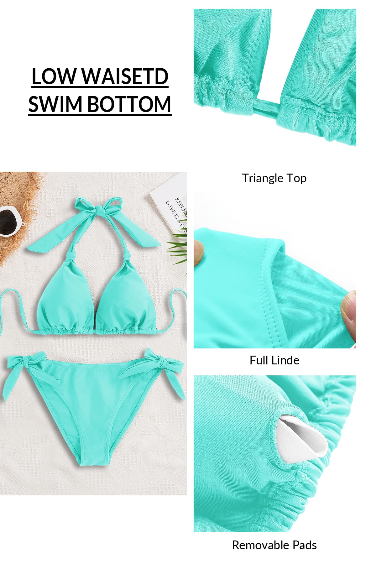 - Tie Swimsuits: The low-rise, moderate bikini bottom with full lining and side ties design makes you more charming. The straps on both sides can be integrated into different shapes.